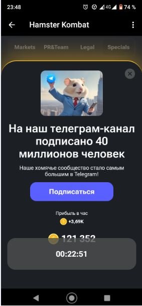 - Приложение-бот Hаmster Kombat - новая хайповая продвинутая игра с большим будущим в мессенджере Telegram, имеющая около 50 млн игроков.